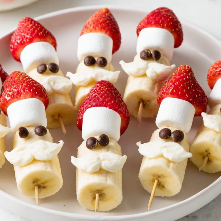 Merken Festlich und spaßig sind diese süßen Spieße mit Banane, Erdbeere und einem Hauch Schokolade, die niedliche Santa-inspirierte Leckereien ergeben – perfekt für Feiertagsvorspeisen oder gesunde Snacks.