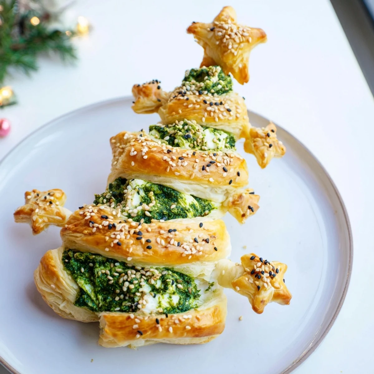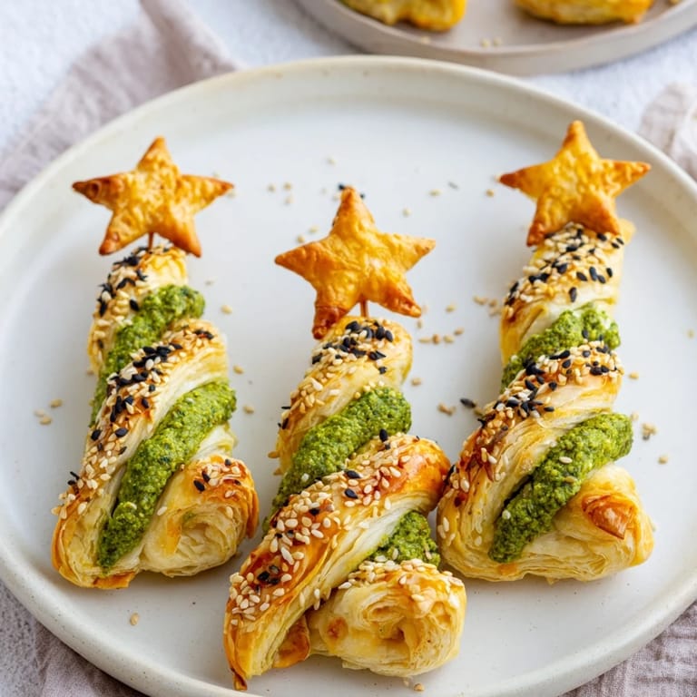 Merken Ein festliches und herzhaftes Blätterteiggebäck in Form eines Weihnachtsbaums, gefüllt mit Kräuterfrischkäse und Pesto. Perfekt für Feiertagsversammlungen und sicher, um Ihre Gäste zu beeindrucken.
