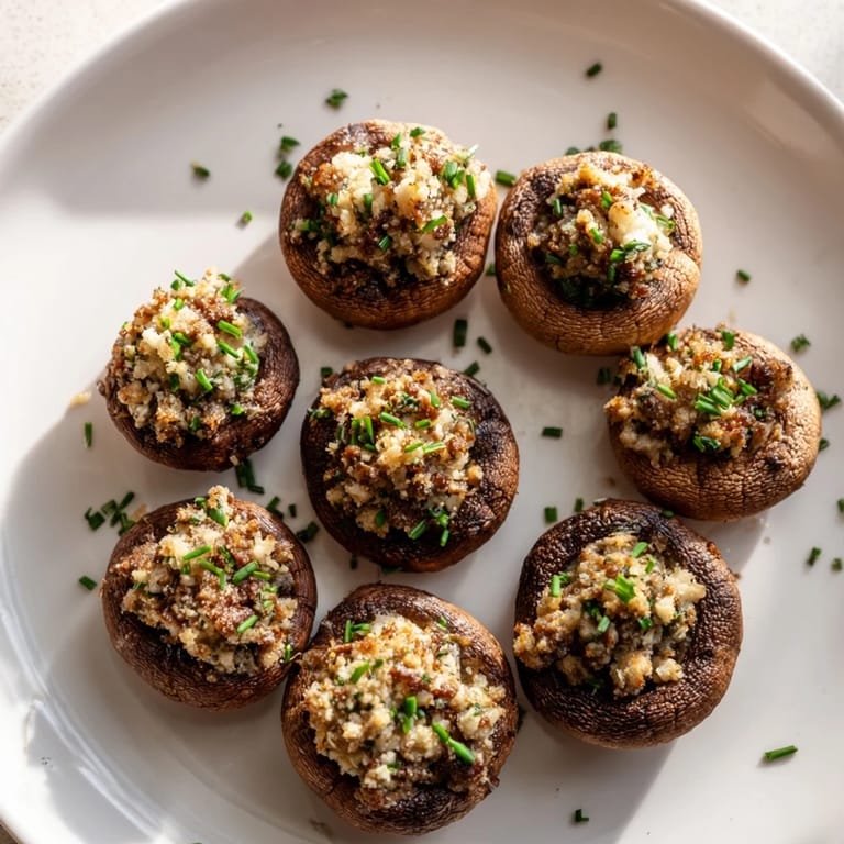 Merken Zauberhafte Vorspeise mit gerösteten Pilzen, gefüllt mit einer herzhaften Kräuter-, Knoblauch- und Käsemischung perfekt zum Unterhalten oder als magischer Snack.