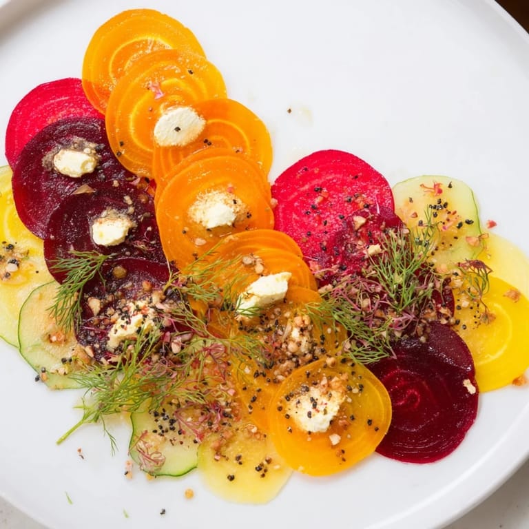 Merken Ich entdeckte diese Plattierung an einem regnerischen Nachmittag, als ich verzweifelt versuchte, ein einfaches Gemüse in etwas Atemberaubendes zu verwandeln. Während ich verschiedene Anordnungen auf dem Teller ausprobierte, bemerkte ich, wie die überlappten Scheiben eine visuelle Bewegung zu erzeugen begannen, als würden sie über den Teller fließen. Dieses Gericht wurde schnell zu meinem Geheimtipp für Gäste, die nicht nur essen, sondern auch ein visuelles Erlebnis mögen. Die Kombination aus Farben, Texturen und diesem Hauch von künstlerischer Absicht machte es zu mehr als nur einer Vorspeise.