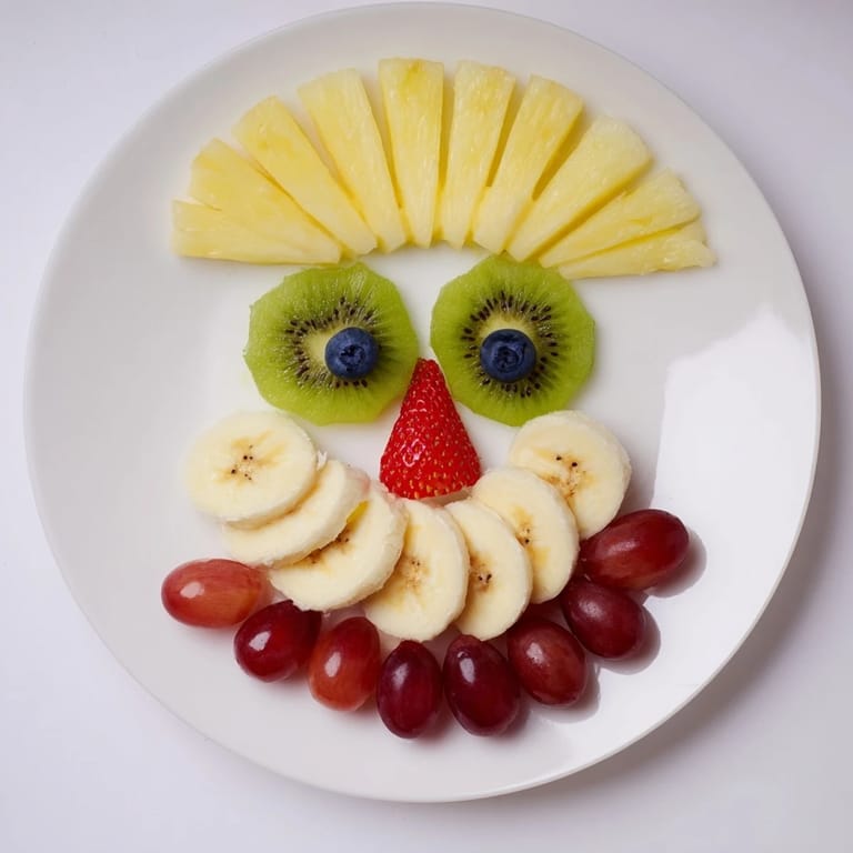 Für das Gesicht werden Bananenscheiben verwendet, ergänzt mit Kiwi und Beeren für die Augen und Nase.