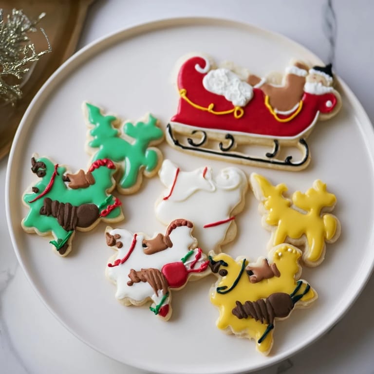 - Die abgekühlten Plätzchen mit gefärbtem Royal Icing, Streuseln und essbaren Dekorationen verzieren. Details auf Schlitten, Rentier, Weihnachtsmann und Akzente auftragen. Mindestens 2 Stunden trocknen lassen.