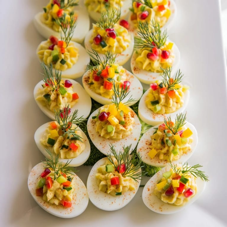 - Die gefüllten Eier dekorieren: fein gewürfelte rote und gelbe Paprika sowie Frühlingszwiebel als Ornamente darüberstreuen, Brokkoli als Baumstamm unten platzieren, Dillzweige für Nadeln nutzen, nach Wunsch Granatapfelkerne und etwas geräuchertes Paprikapulver zum Garnieren hinzufügen.