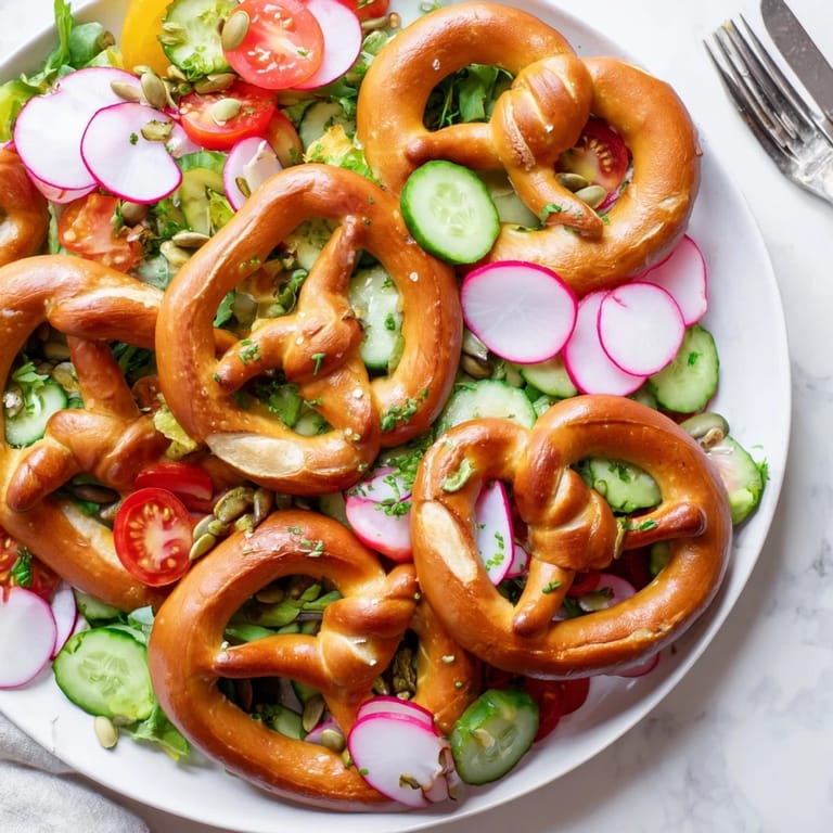 Merken Ein herzhafter, würziger Salat, der knackiges Gemüse, würzige bayerische Brezeln und ein klassisches Senfdressing kombiniert—ein Favorit in Biergärten und perfekt für Zusammenkünfte.
