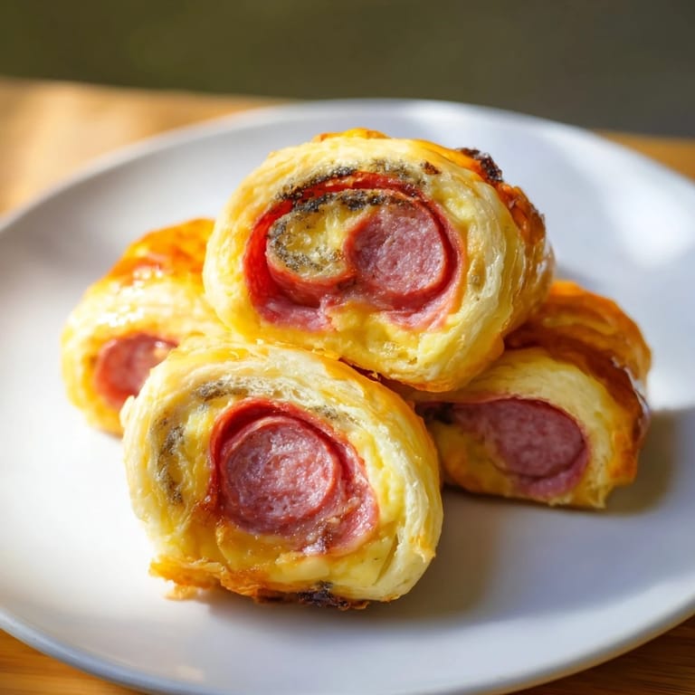 Merken Buttrige, goldene Blätterteigschnecken gefüllt mit würzigem Cheddar und herzhaftem Salami – perfekt für Partys oder zum Naschen.