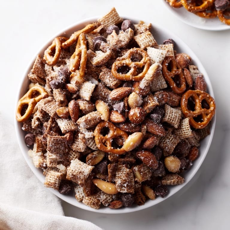 Merken Ein knuspriger, süß-salziger Snackmix, inspiriert von der Form und den Aromen von Tannenzapfen—perfekt für festliche Zusammenkünfte oder Winterfeiern.