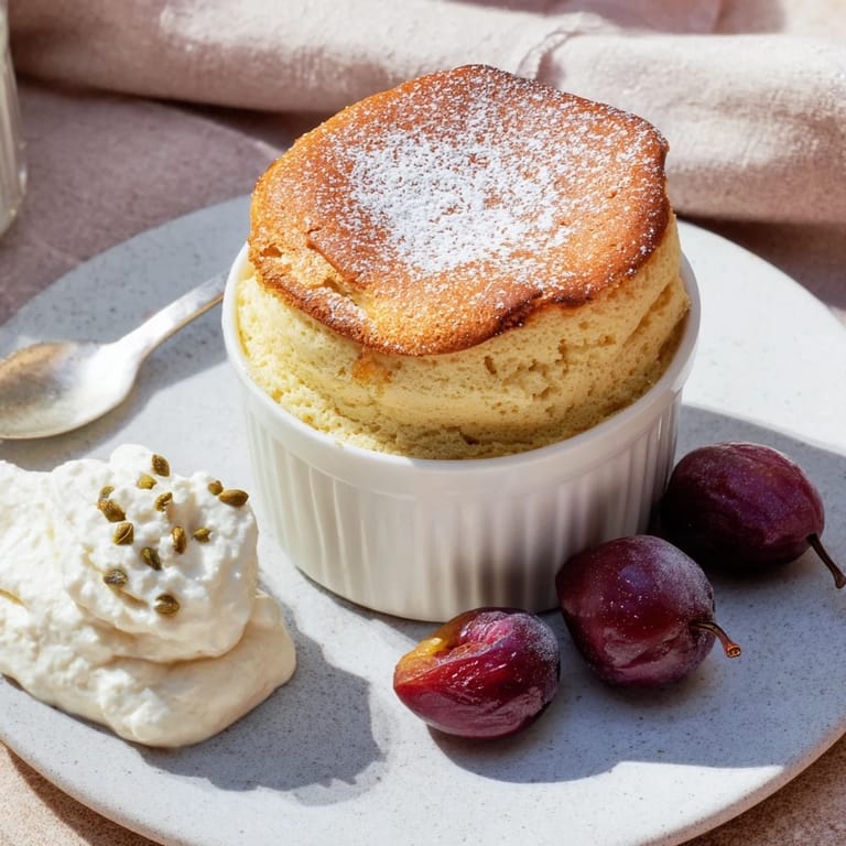 Merken Ein festliches, luftiges Soufflé mit Glühwein-Aroma, serviert mit würziger Pflaumenkompott und samtiger Vanillesahne.
